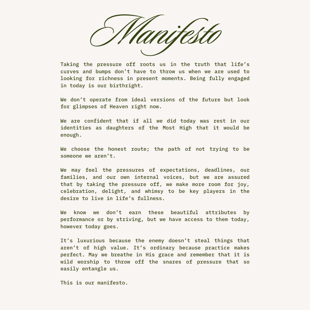 I want to start off this year by reminding myself and maybe explicitly telling you for the first time, what I am about over here. I wrote this manifesto of sorts at the end of 2023 and have tweaked it here and there as the messaging around “take the pressure off” has become more clear. This manifesto grounds my writing and is what I hope to be a rallying cry for you as encouragement in this pressure-free life.